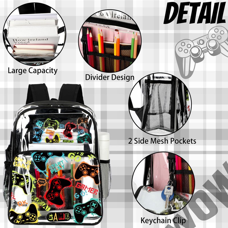- Elegant Design: the heavy-duty transparent backpack adopts a transparent design, which is convenient for you to quickly check the contents of the bag; It adopts a cool game console design with bright colors and eye-catching, making you more distinctive