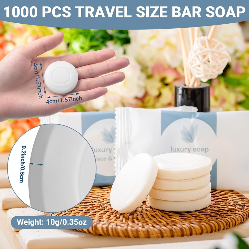 Features:Thoughtful presents:The bath soap bars are large in quantity, which can be prepared for your companions, classmates, colleagues, partners, family members and more that you cared, thoughtful and delicate.Store for a long time:The mini soap bars are light in weight and general in packaging, so you can store many of them at home. When you use up one, you can replace another in advance.Specifications:Main material: pure natural vegetable oil soap baseColor: white for the soapSize: about 1.57 x 1.57 inches/ 4 x 4 cm, 0.2 inches/ 0.5 cm in thicknessPackage includes:800 x Travel size hand soapsNotes:Manual measurement, please allow slight errors on size.The color may exist a slight difference due to different screen displays.You can test before use, please use with caution if you have severe skin allergies.