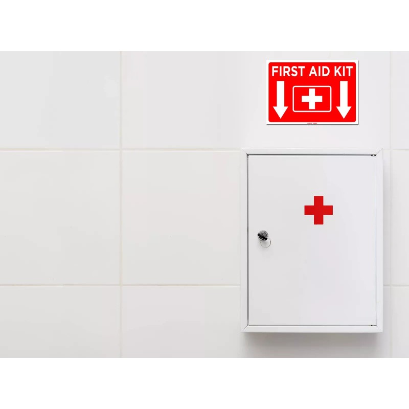 - SAFETY FIRST: Workplace safety is extremely important in any store or building. Labeling the location of your first aid kit box can help save lives in an emergency situation. This first aid sign has bright red colors with arrows pointing to the box with first aid supplies like medicine and bandages. Make sure your medical station is visible whether its in a restaurant, office, store, hotel, hospital, school, or vehicle. Keep your workers and customers healthy and safe