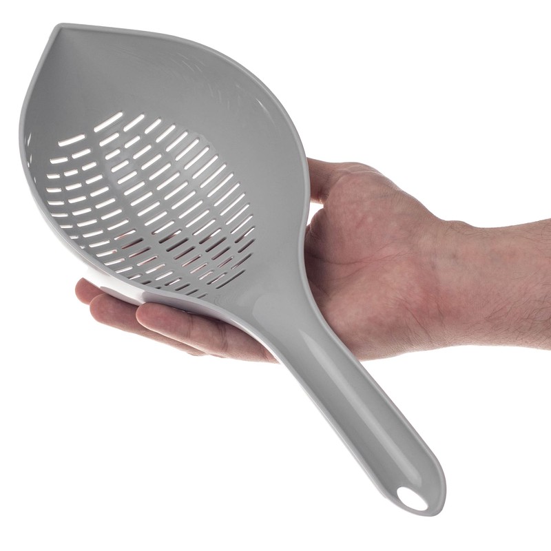 - Ergonomic Design The handle of the kitchen strainer has been designed to fit comfortably in the hand and will not be uncomfortable even with prolonged use. The non-slip surface also ensures a secure grip, even with damp hands.