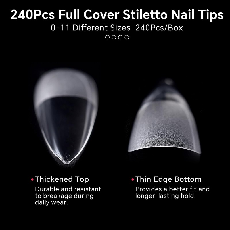 KADS Kurze Nagelspitzen für Acrylnägel, transparent, künstliche Spitzen, quadratisch, lang, Stiletto für Maniküre mit Box, transparent, lang, Stiletto, 240 Stück