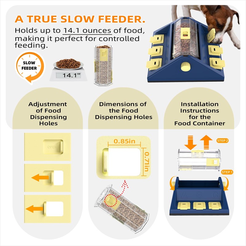 - [Adjustable Food Dispensing Holes for Tailored Challenges] The toy’s food dispensing holes are fully adjustable, each with its own switch to control food flow. You can close one or more holes to increase the difficulty level, or adjust the hole size based on the treats or kibble you use. This flexibility allows you to control the dispensing speed and customize the challenge for your dog’s size, intelligence, and eating habits. Not only does this encourage more mental stimulation, but it also promotes a slower, healthier eating pace, preventing dogs from eating too quickly and improving their digestion.