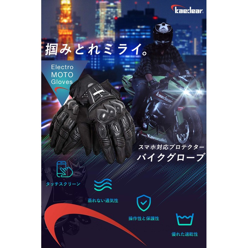 - Electro Moto Gloves: Kaedear is a brand that focuses on electronic equipment and accessories for motorcycles.A highly-sensitive fabric compatible with the touchscreen of smartphones is sewn into the index and middle fingers.We use a material that has good sensitivity and durability among those compatible with touchscreens.(Rubber touch panel compatible fabrics have poor sensitivity and wear out quickly)