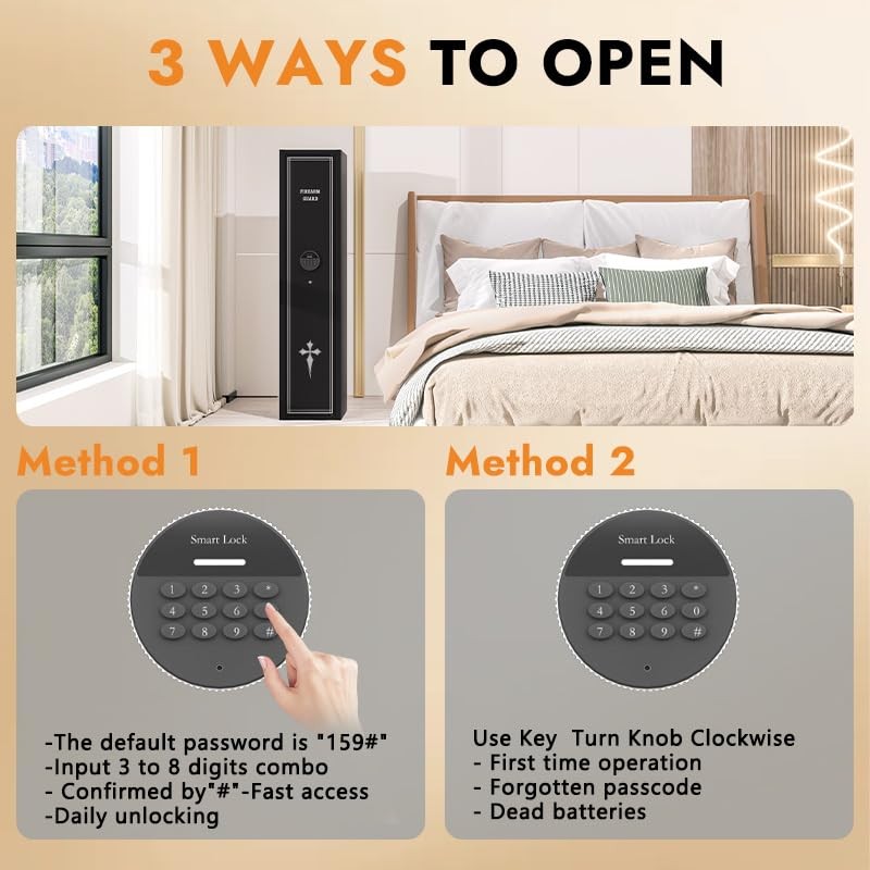 • 【3- Ways to Unlock】 The gun cabinet comes with three types of unlocking methods, including fingerprint lock type, key lock and external battery pack when your battery is dead.