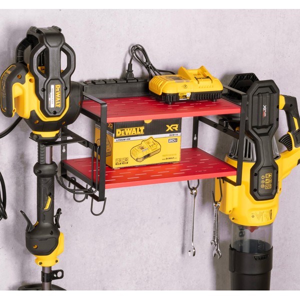 KAFAHOM Leaf Blower and Weed Eater Rack with Charging Station, Lawn Power Tool Organizer Wall Mount, Lawn Tool Storage Rack for Leaf Blower, Weed Eater, Battery, Charger, Red