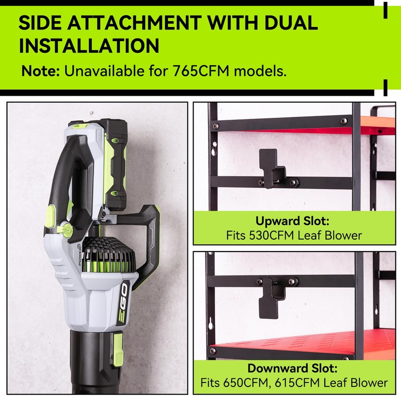 - Universal Leaf Blower Hanger: This adaptable hanger can be mounted both ways to accommodate different blower models. When installed facing up, it’s compatible with the 530CFM model, and when installed facing down, it supports the 650CFM and 615CFM models. Please note, this hanger is not suitable for the 765CFM model. Keep your workspace organized and maximize storage potential with this versatile solution.For non-compatible but handled models, you can also hang them on the included mover hooks.