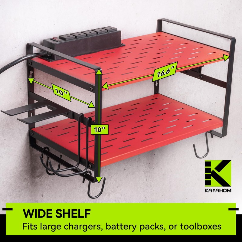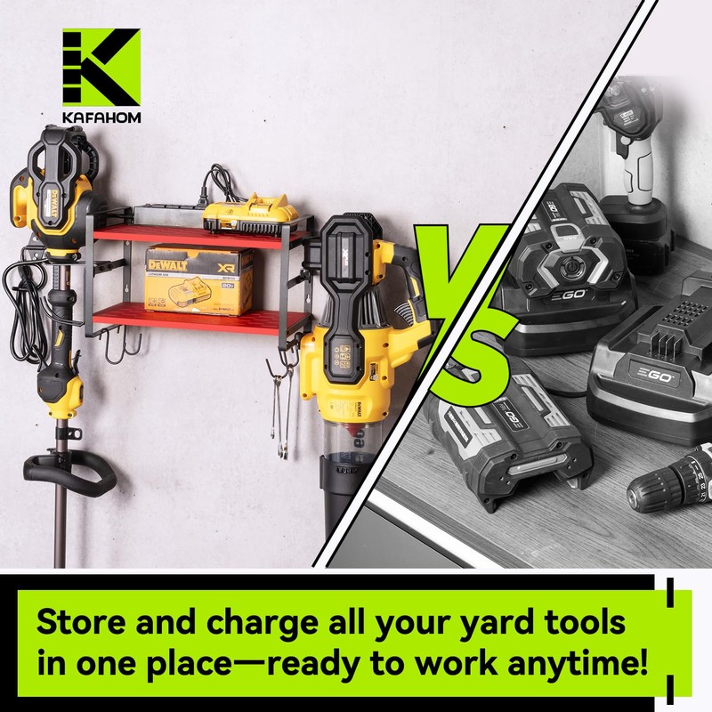 - Spacious & Versatile Storage Shelves: Two large plates of the Lawn Power Tool Organizer Wall Mount for Garage offer generous space for storing 40–56V batteries, toolboxes, chargers, and other garage essentials. Designed to securely hold various equipment, these shelves provide easy access while maintaining a clean and organized workspace. Ideal for consolidating your tools and accessories in one central, accessible location.