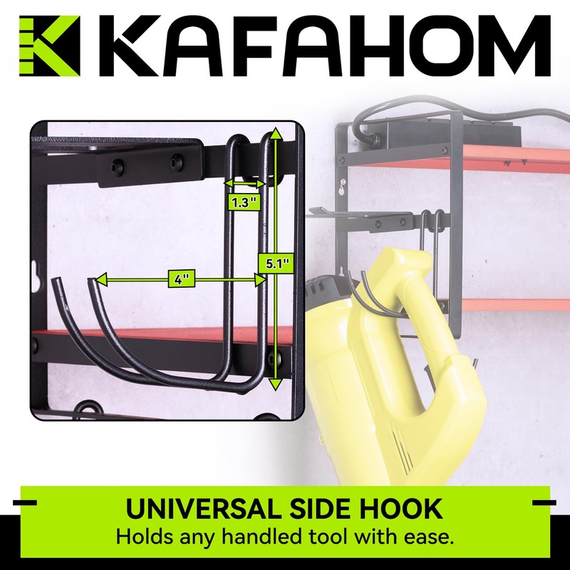 - Versatile Storage with S-Hooks: Beneath the main structure, four S-shaped hooks provide additional hanging space for various accessories such as rags, handles, or other garage essentials. These hooks are perfect for storing items that don’t fit neatly on shelves, allowing you to keep your workspace tidy and organized. With these flexible options, you can easily adjust the organizer to accommodate your specific storage needs, maximizing efficiency and minimizing clutter.