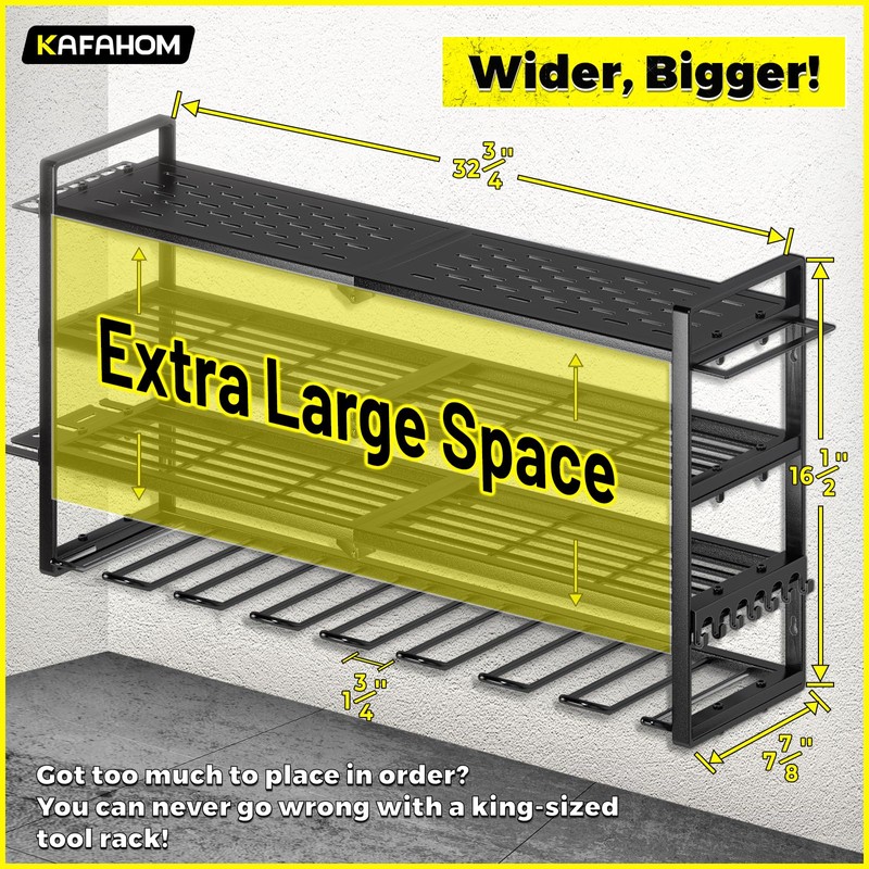 - Extra Large: Elevate your workspace organization with the KAFAHOM 8-slot Power Tool Rack, boasting four tiers of spacious storage. The upper three tiers provide ample space for all your power tool accessories and miscellaneous workshop items, while the bottom tier features eight universal power tool slots, ensuring everything has its place.