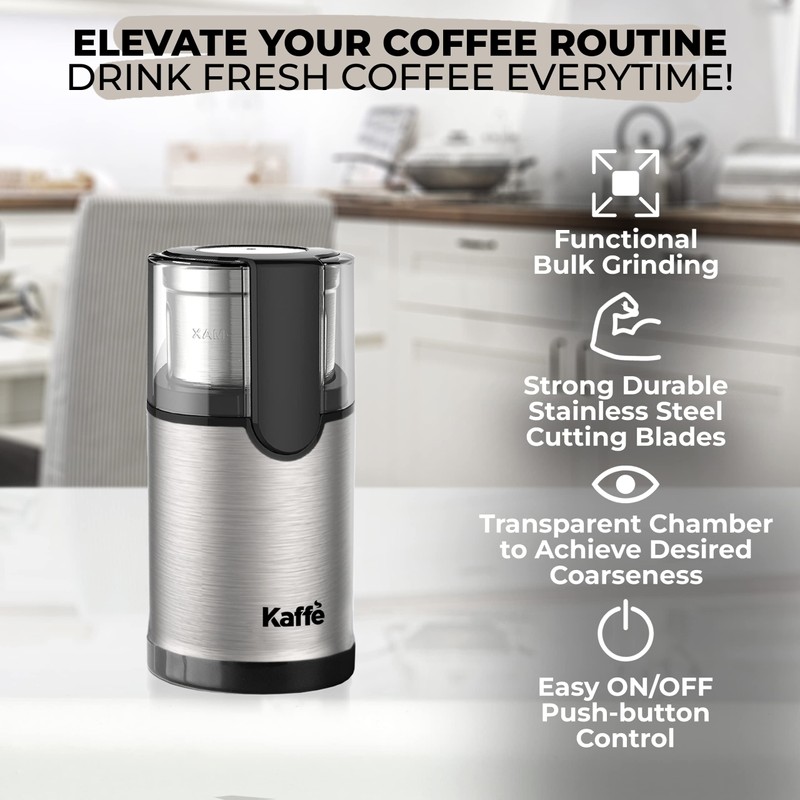 Kaffe Electric Coffee Bean Grinder w/Removable Cup & Cleaning Brush. Easy On/Off Operation for Espresso, Cold Brew, Herbs, Spices, Nuts. (14 Cup / 3.5oz) Stainless Steel