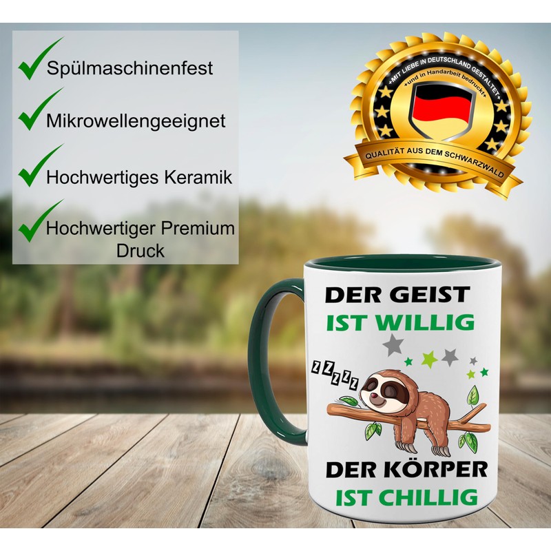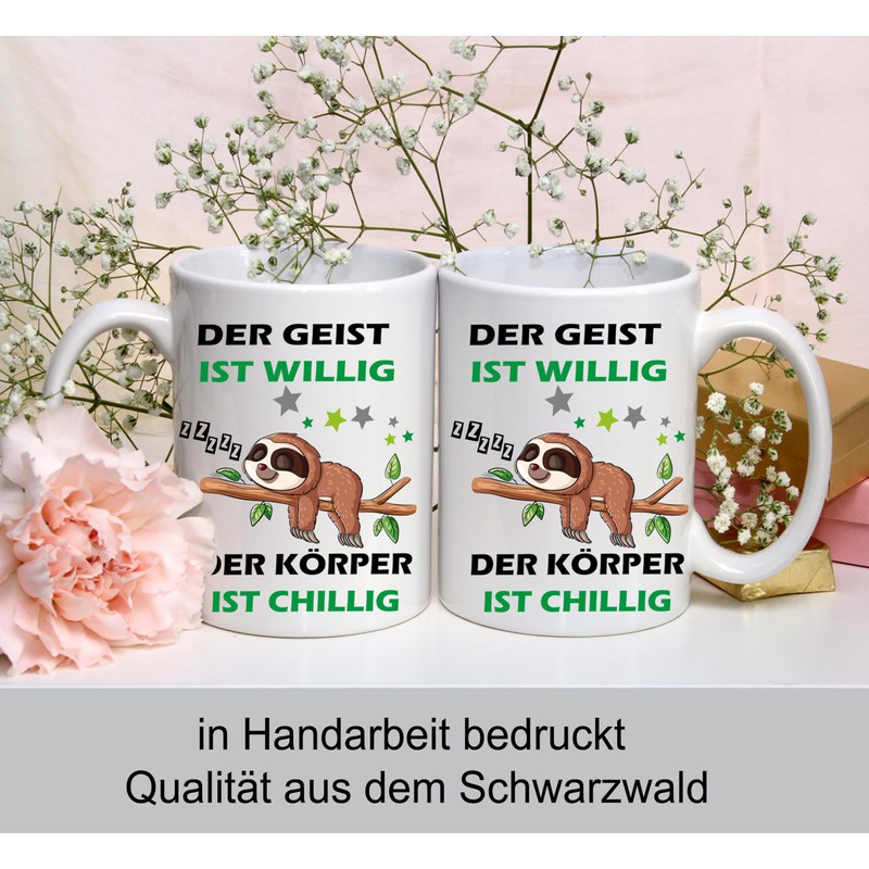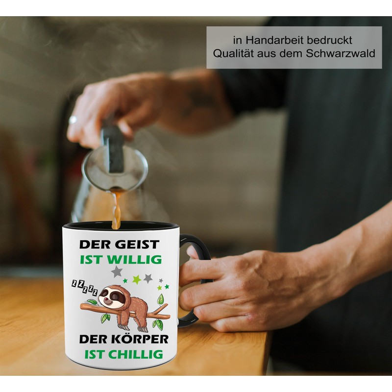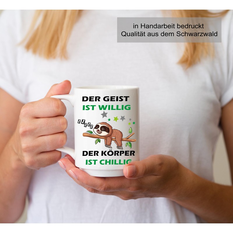 Kaffeetasse mit Lustigem Spruch Der Geist ist willig- der Körper ist chillig Tasse |Geschenk Idee| Kaffee Tee Bürotasse | Fototasse, Motivtasse | Kaffeetasse, Teetasse |Keramik (Rot)