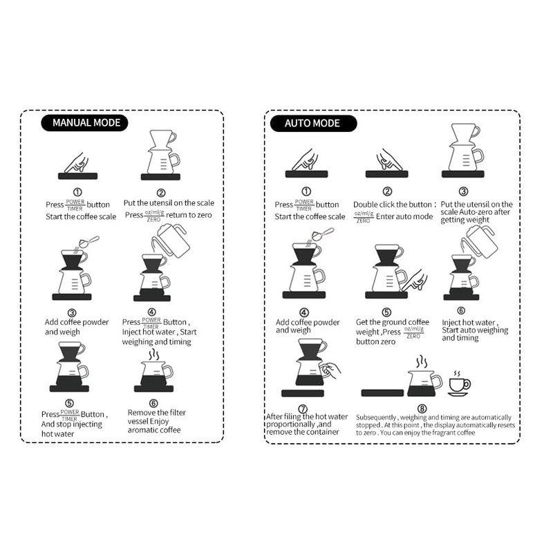 - Zwei Modelle: 1. Setzen Sie im automatischen Zeithaltemodus (Auto) die Kaffeeeinheit ein, die Waage erkennt automatisch das Gewicht und setzt es auf Null, sobald es sich stabilisiert hat. 2. Kaffeepulver oder Flüssigkeit einfüllen, zum Tarieren kurz die rechte Taste drücken, Wasser in die Kaffeemaschine gießen, auf der linken Seite startet die automatische Zeitmessung und auf der rechten Seite wird das Gewicht des eingefüllten Wassers angezeigt.