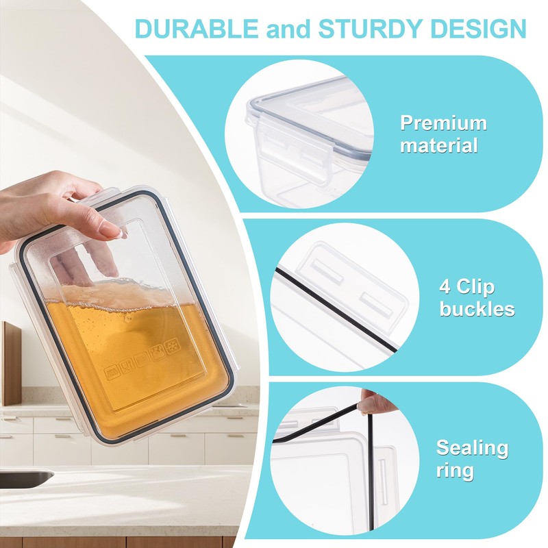 - LEAK-PROOF Freshness: These plastic food storage containers have high quality sealing rings and clip fasteners to ensure effective insulation from air and moisture. This makes them ideal for keeping meats, fruits and vegetables fresh for days.