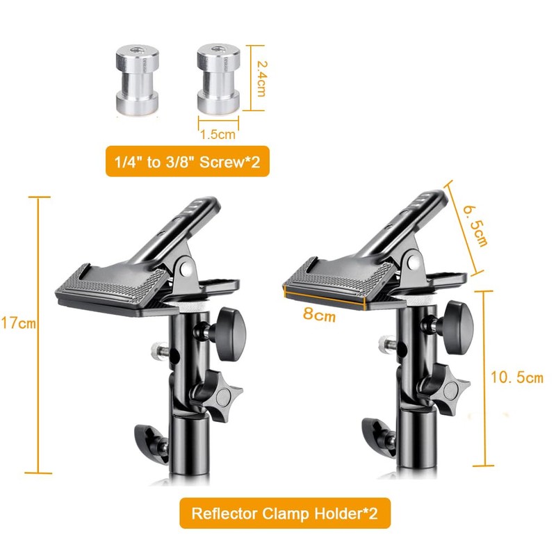 Package contents: 2 x reflector clamp holders; 2 x 1/4 inch to 3/8 inch screws