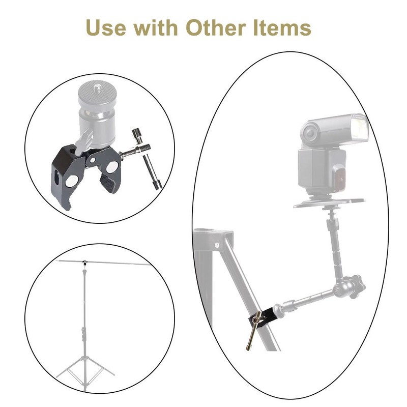 - Unparalleled Versatility:The super clamp can be mounted on virtually anything, from DSLR rigs and camera equipment to lights, hooks, shelves, and more.This incredible versatility makes it a must-have accessory for photographers, videographers, and content creators.