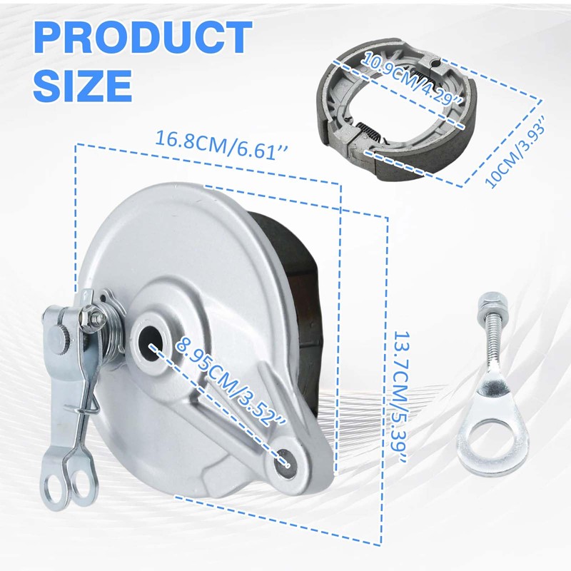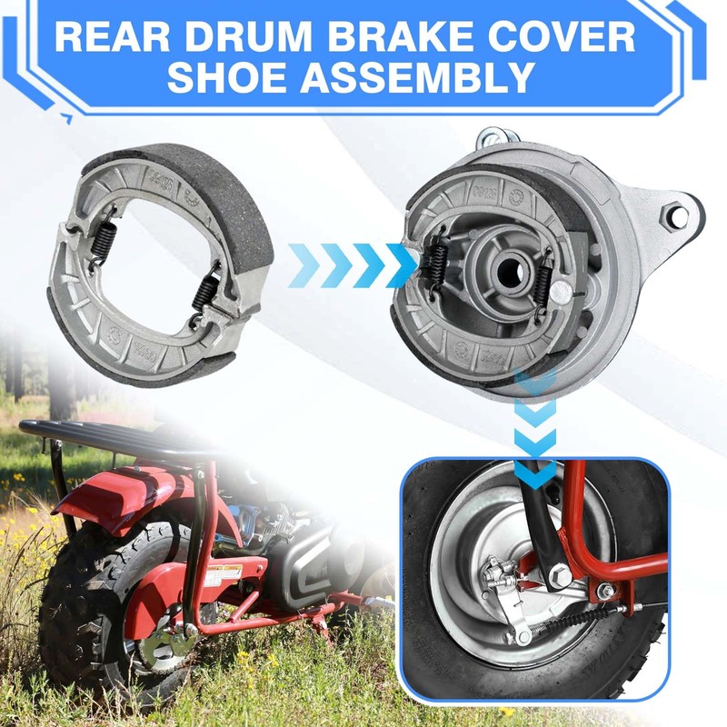 - Complete Kit Included: Comes with 1 brake drum, 2 brake shoes, and 2 chain tensioner adjusters. Offers everything needed to upgrade or replace your mini bike’s rear braking system