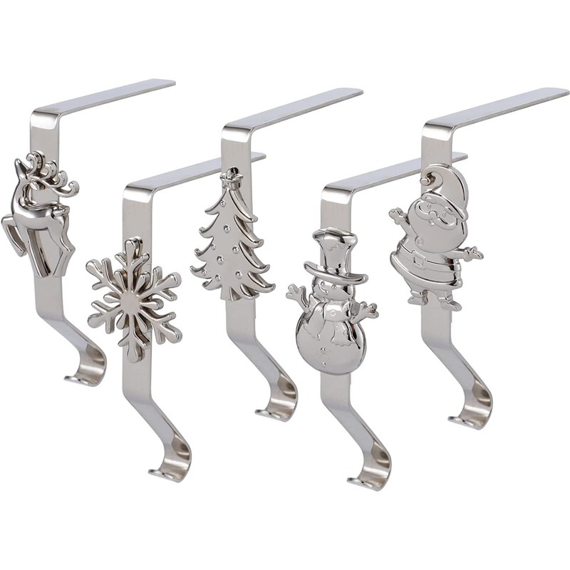 KAHEIGN 5Pcs Christmas Stocking Holders, 5 Styles Snowflake Reindeer Snowman Gnome Tree Metal Fireplace Stocking Hangers No-slip Mantel Stocking Hooks for Christmas Party Decoration (Silver)