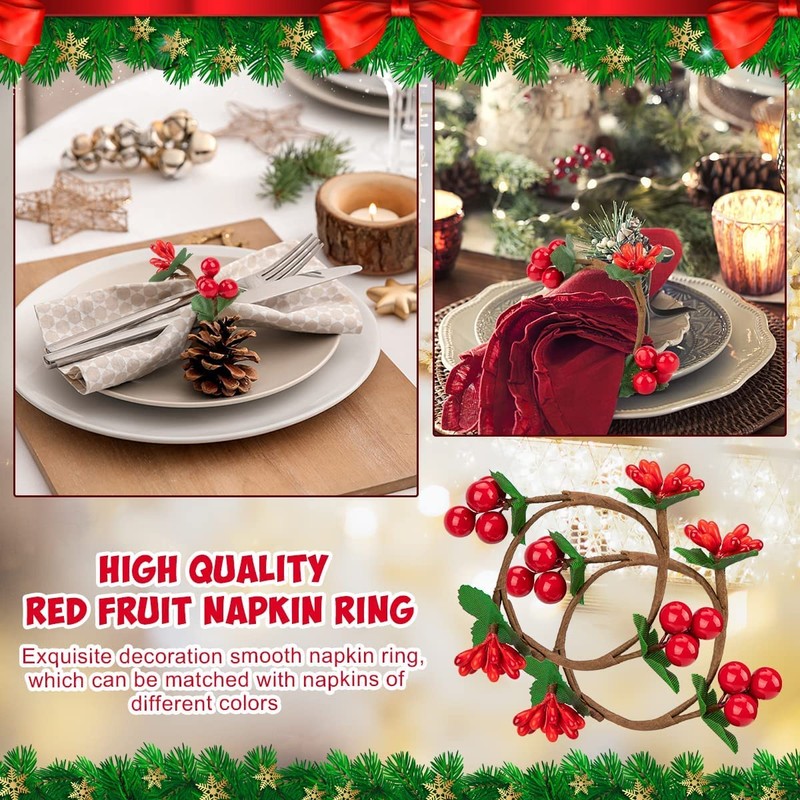 - [Christmas Style] Each napkin ring is wrapped with faux red berries, with green leaves made of raw silk to look like real holly berries and create a classic Christmas rustic retro style