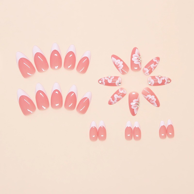 Description:Medium almond pink floral press on nails for women girlsshape: almondcolor: pink & whiteQuantity: 24 pcs/boxMaterial: acrylicHow to Use?1. Choose a false nail of the right size for each finger.2. Gently polish the nails and false nails with our complimentary nail file to get a better fit.3. Clean your nails and wait for the nails to dry before proceeding to the next step.4. Stick a Jelly glue sticker on the nail, stick the fake nail from the root of the nail to the front of the nail, and then press it for 10 seconds.5. Trim according to the shape and length of the press on nail you want.Acrylic nails press on how to remove?1. Soak your nails in warm water and gently peel off the glued nails from the side after a few minutes.2.Remove the glue sticker and keep the acrylic nails glue on for next use.