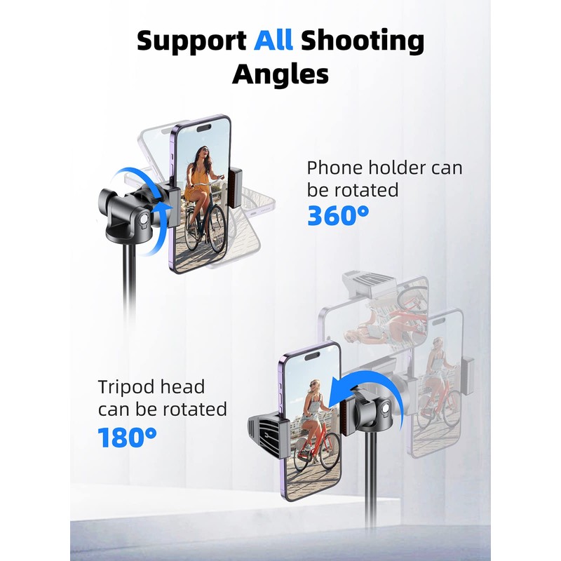 • [Support All Shooting Angles]: The tripod head is 180 rotational, and the phone holder can 360 adjust. You can set your phone freely at 720 on this phone tripod and always find the best shooting angle quickly