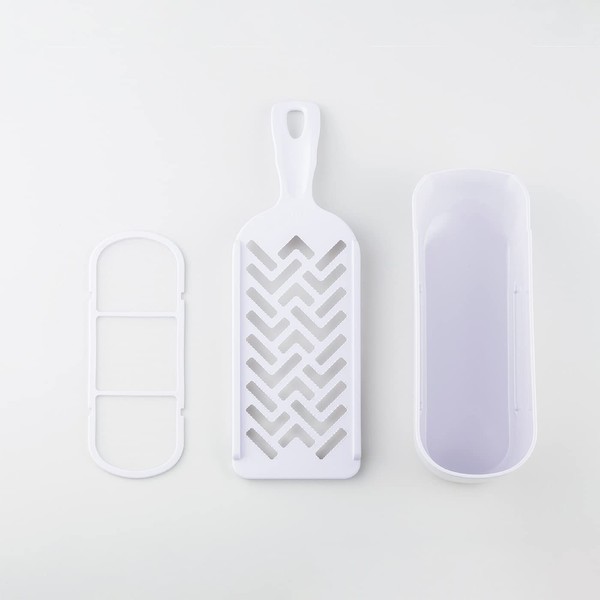 • This grater is full of ingenuity to make it a delicious grater without putting effort into it. The long grater surface makes it easy to grate large ingredients such as radish. We added twist to the alignment of the blade and the height of the eye. Blade angle is 45 degrees diagonally. Each eye has been changed in height and pitch for less resistance and even gration. The 7-degree angle plate makes it easy to apply pressure to food. Includes a perforated tray to remove excess water for grating radish