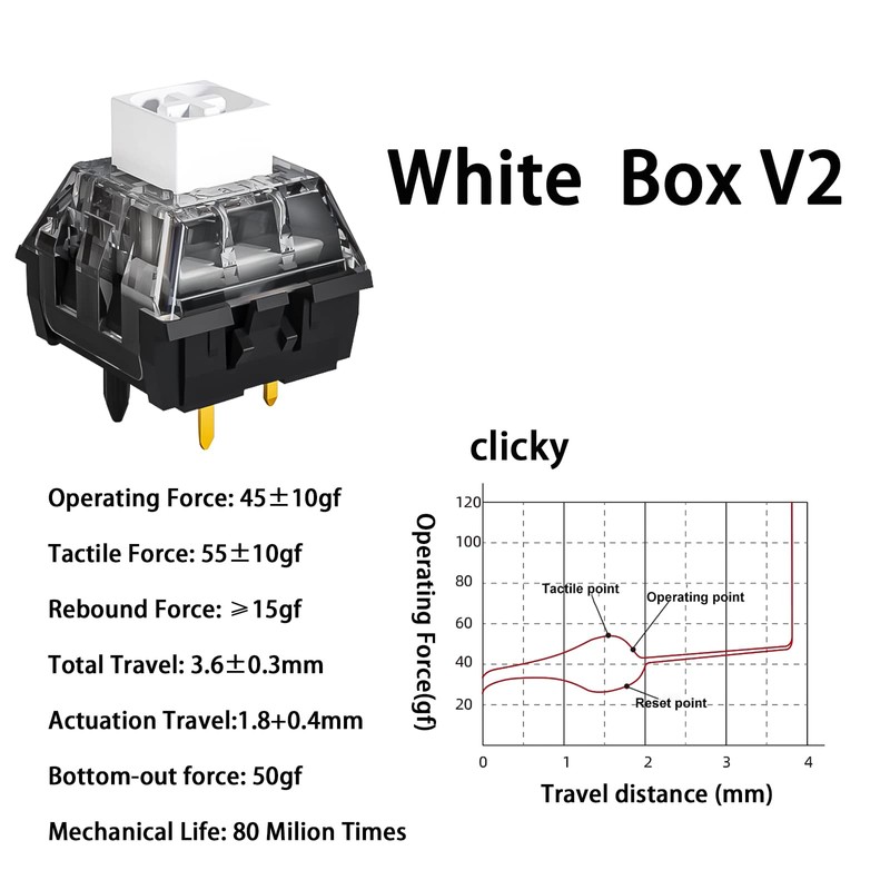- [Keyboard Switch] Kailh BOX White V2 Clicky Keyboard Switches,Longer gilded spring,Faster rebounding speed,Corrosion resisted,Rust Prevented,Approximate lifespan of 80 million times of keystrokes based