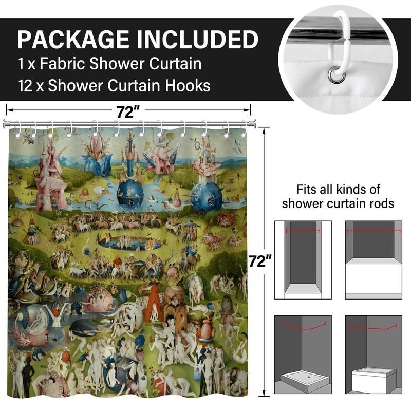 KAIRA Classic Art Shower Curtain A Garden of Earthly Delights 72 x 72 Sophisticated Polyester Fabric, Hooks Provided