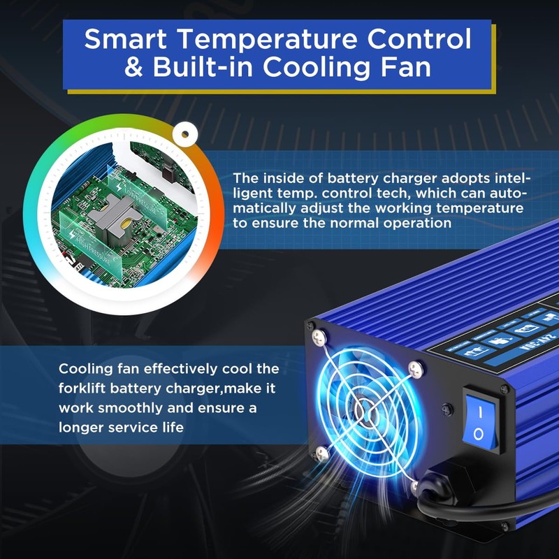 - Smart Temperature Control & Built-in Cooling Fan24V forklift battery charger adopts intelligent temperature control technology, which can automatically adjust the working temperature of electric pallet jack charger to ensure the normal operation of pallet jack battery charger. The golf cart battery charger is equipped with a cooling fan to effectively cool the 24v floor scrubber battery charger and make it work smoothly.