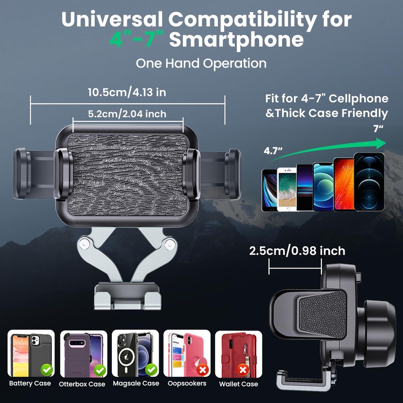 • 【Upgraded Flexible Phone Holder】The phone mount with quick release button and adjustable clamp arms, it is universal compatible with iPhone, Samsung ,most smartphones and devices.one-handed use,make your driving safer, comfortable and convenient experience the driving of fun
