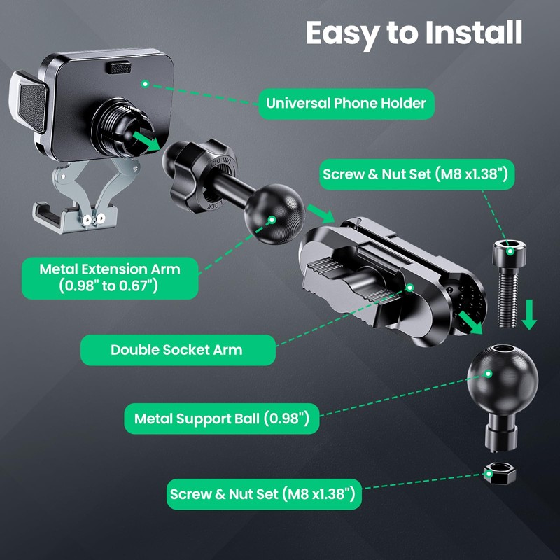 • 【Package Included】 The package include 1x 0.98" metal ball and screw set, 1 x 0.98“ to 0.67" arm adapter, 1x magnetic phone holder and, 1 x metal double socket arm, please contact us if you have any question about it