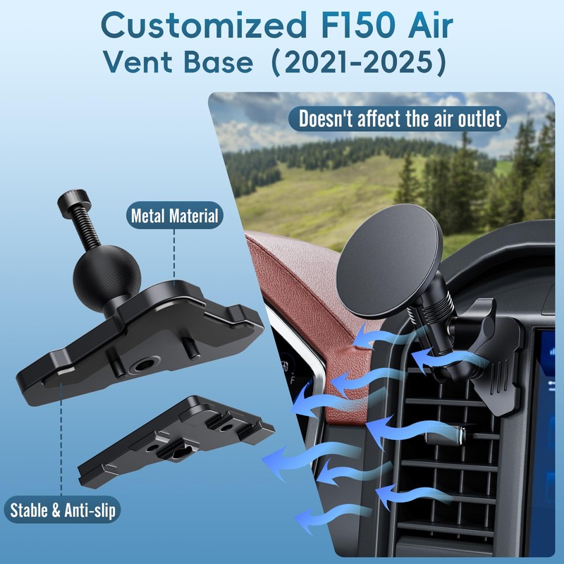 - 【Easy Installation & Operation】Install in just one minute following the instructions. The dedicated base mounts of F150 securely on the vent without risking damage to your car. You can effortlessly place and remove your phone with one hand, simplifying your trip. Tips:Press it until it completely wraps around the baffle while installing the metal plate base