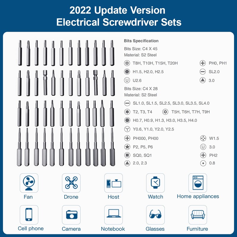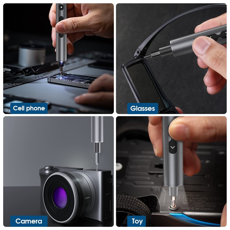 • 2022 Upgrade Version Electric Screwdriver Pen: The 62 in 1 torque screwdriver is made of upgraded quality aluminium alloy for a comfortable touch and longer life. Also Small screwdriver set with dual power mode design and one-touch switching. This cordless electric screwdriver is designed with 48 precision bits that suitable for most modern electronics such as smartphones, laptops, tablets, cameras, game controllers, radios, printers, drones, toys, glasses, watches etc.