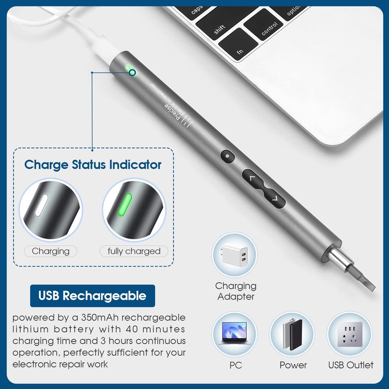 • USB Rechargeable & LED Light: This power screwdriver has a speed of 200r/min, automatic/manual mode, torque 0.25-0.35/3N.m and a 360 shadowless lighting design with 3 LED lights embedded to illuminate the working area. USB charging cable included for fast and convenient charging. Cordless design, powered by a 350mAh rechargeable lithium battery with 40 minutes charging time and 3 hours continuous operation, perfectly sufficient for your electronic repair work.