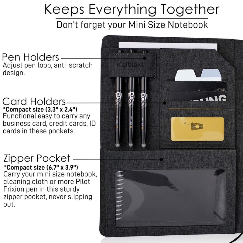 - Functional and Professional - If you are looking for a cover that allowed you to utilize the notebook while bringing in the functionality of a portfolio cover, you really need to try our products! The clear zipper pouch allows you to put in 5 different colors of pens, cleaning cloths. Other than the zipper pouch, we have 3 pen holders, 3 business card slots, 1 large front pocket, 1 large back pocket, and 1 large inside file pocket.