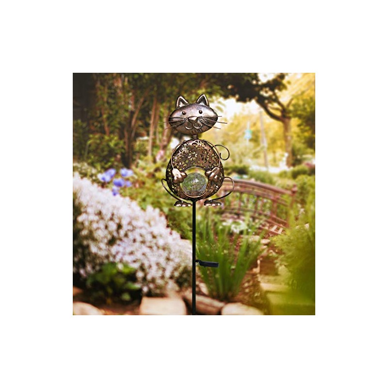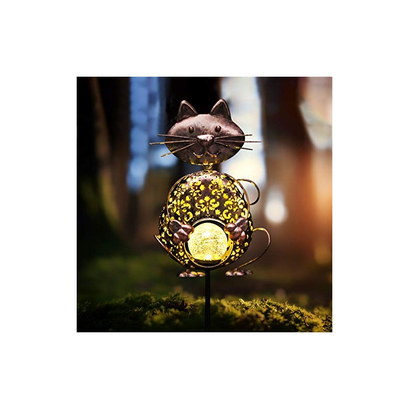 - 【SOLAR POWERED OUTDOOR DECOR】:This solar lights outdoor decorative with cat wrought iron and crack glass design provides an amazing Pattern effect to create a romantic atmosphere,easily add ambiance to your garden,outdoor and pathway.Led lights work last up to 6 - 8 hours each time when fully charged, energy saving, eco-friendly.