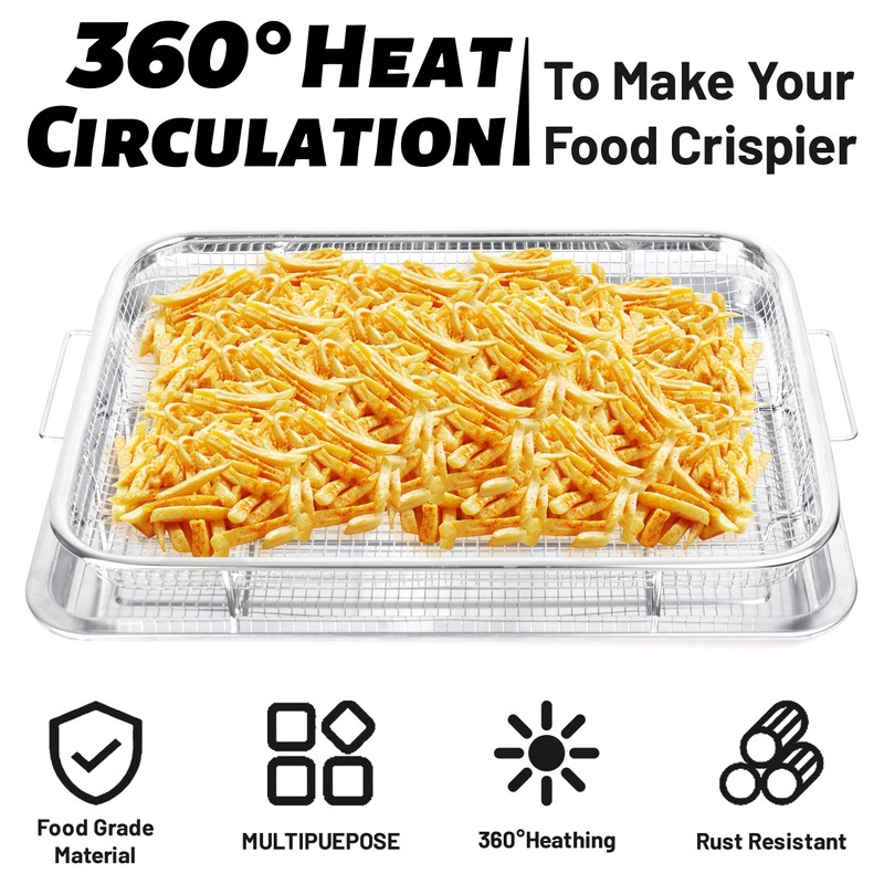 - 360° Circulation Heating: The mesh design of the air fryer basket promotes air circulation and distributes the heat evenly all over the food. Our air fryer rack allows for even heat circulation, no need to flip or turn your food while cooking, no risk of scorching. This ensures that your food is evenly cooked and crispy on all sides.