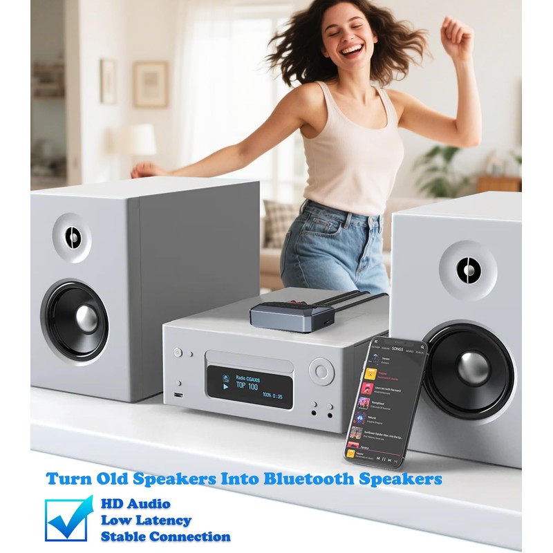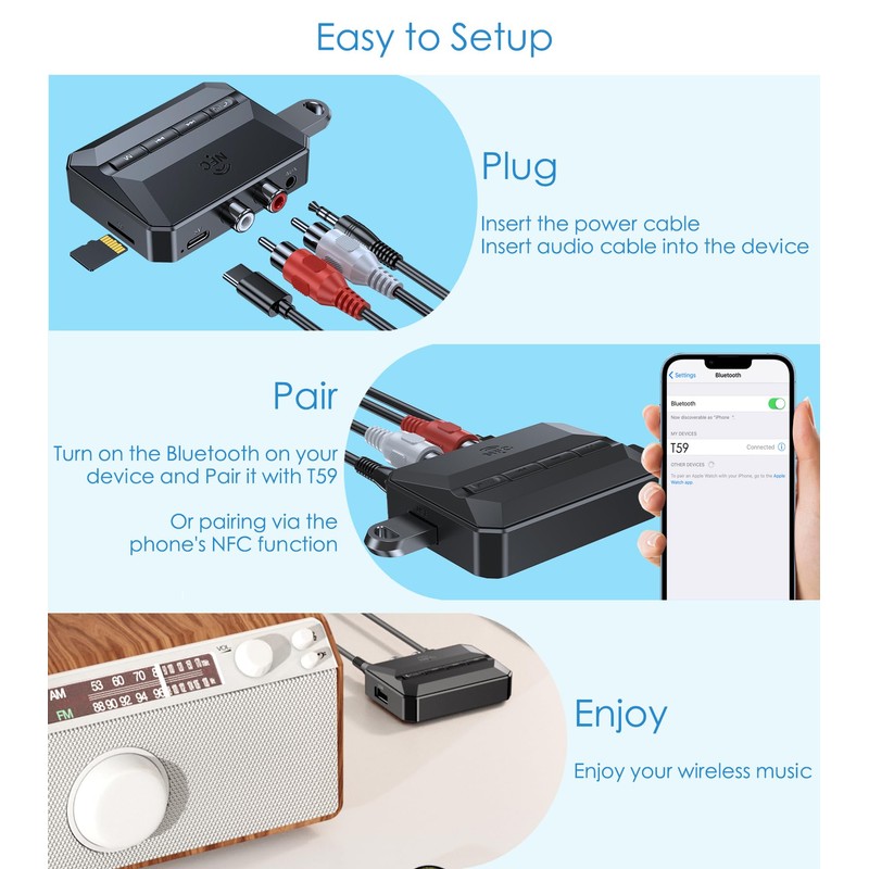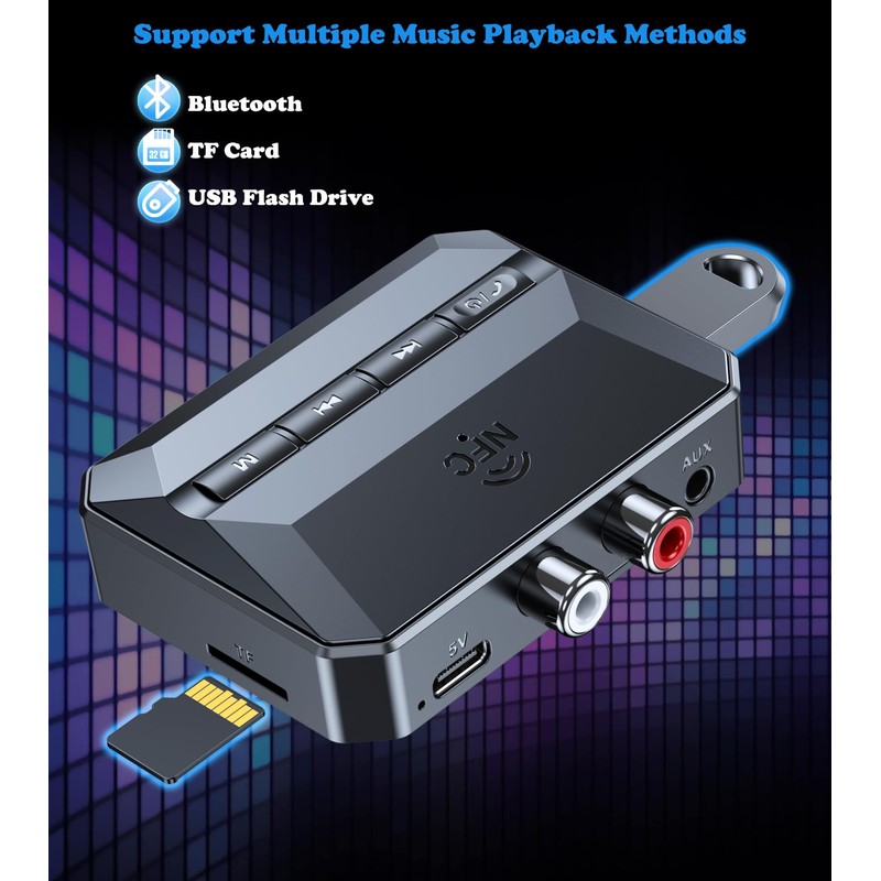 - MULTIFUNCTIONAL INTERFACE: AUX Bluetooth adapter for old receiver supports RCA / 3.5mm jack / NFC quick connect, and also supports a USB drive and TF card to play music. Which is compatible with 99% of speakers, old AV receivers, car stereos, and home stereos. Easily add high-quality wireless capabilities to your sound system.