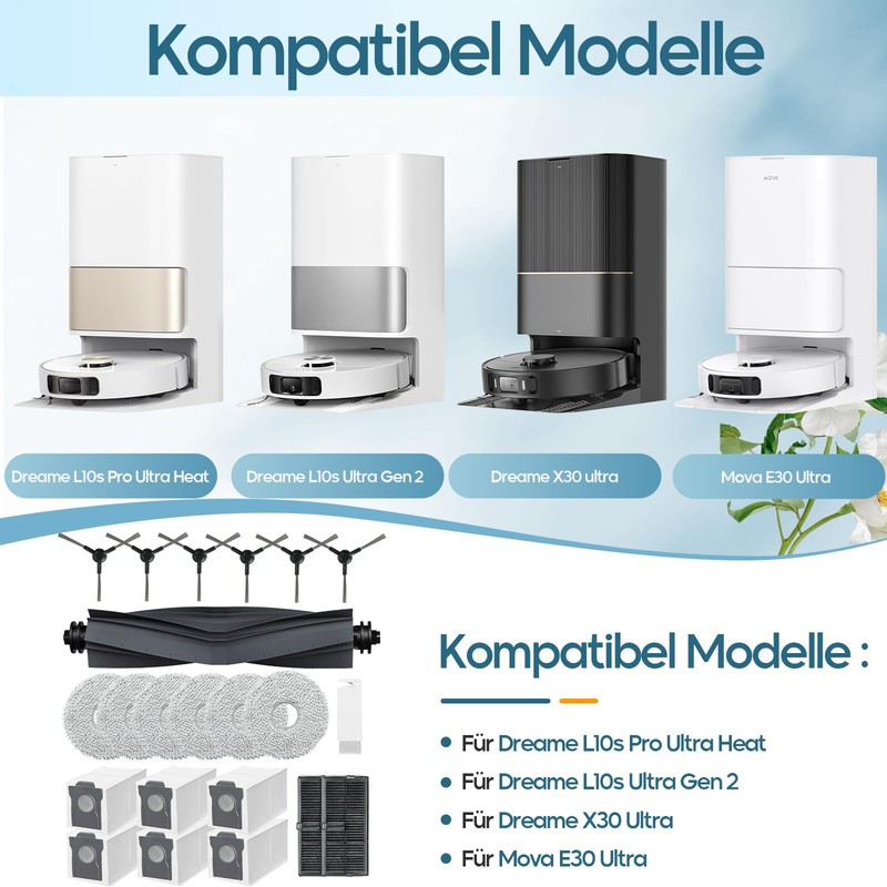 - ??Kompatible Modelle??Ersatz Zubeh?r nur f1r Dreame L10s Pro Ultra Heat/ L10s Ultra Gen 2/ X30 Ultra/ Mova E30 Ultra Staubsauger, Lieferumfang: 6 x Staubbeutel, 1* Hauptb1rste, 6* Seitenb1rsten, 2* Filter, 6* Wischtuch, 1* Reinigungsb1rste. Bei Fragen zur Produktkompatibilit?t kontaktieren Sie uns bitte