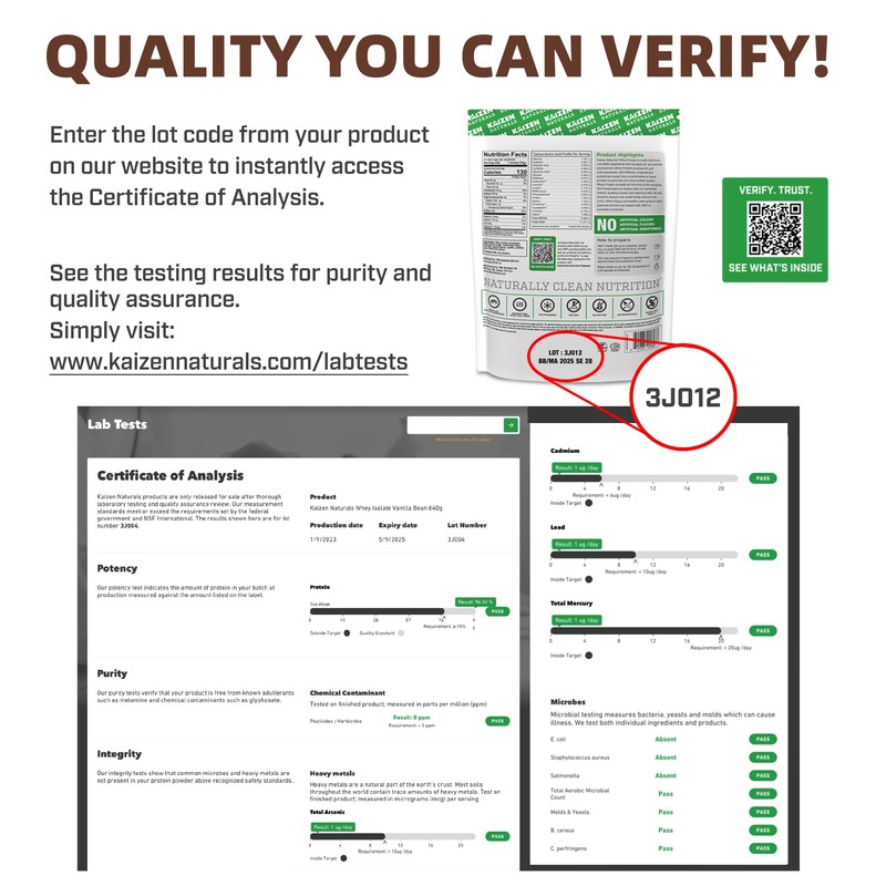 - See the Test Results: At Kaizen Naturals, transparency starts at home. Unlike many brands that rely on third-party manufacturers, we proudly produce every lot in our very own GMP certified facility. Owning our facility allows us complete control over ingredient sourcing, manufacturing quality, and product standards. To verify our commitment to quality, each finished lot is rigorously tested in an ISO 17025 certified lab for purity, potency, and integrity. We openly share these test results online, so you can see exactly what's in your product - and what's not. Simply scan the QR code on your package and enter the lot code to view your results.