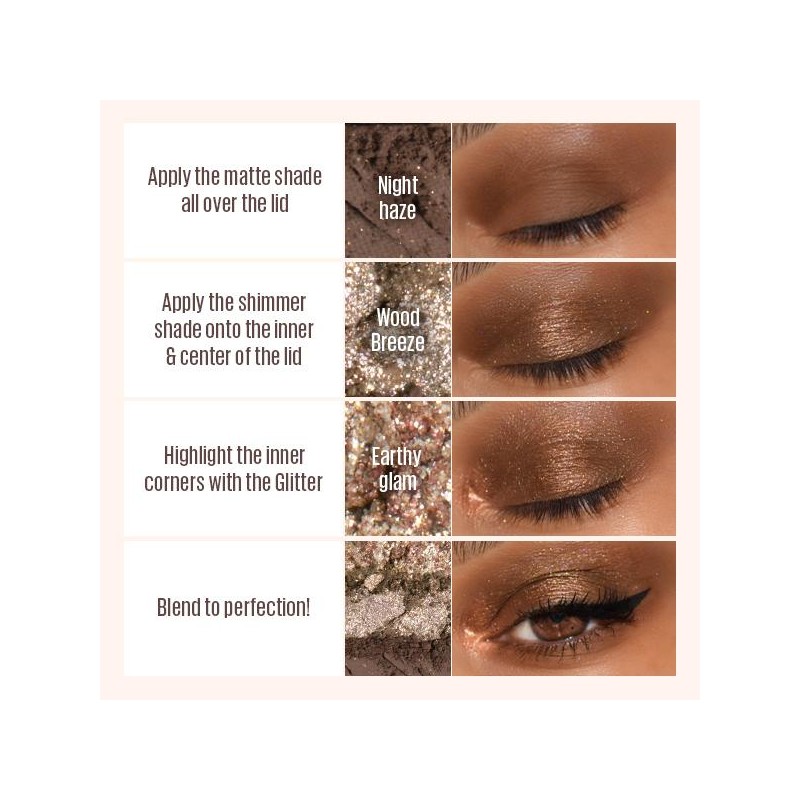 Available in 13 trio stacks. These bouncy eyeshadows come packaged in trios of various matte, shimmer and glitter formulas that apply effortlessly with your fingertips.
