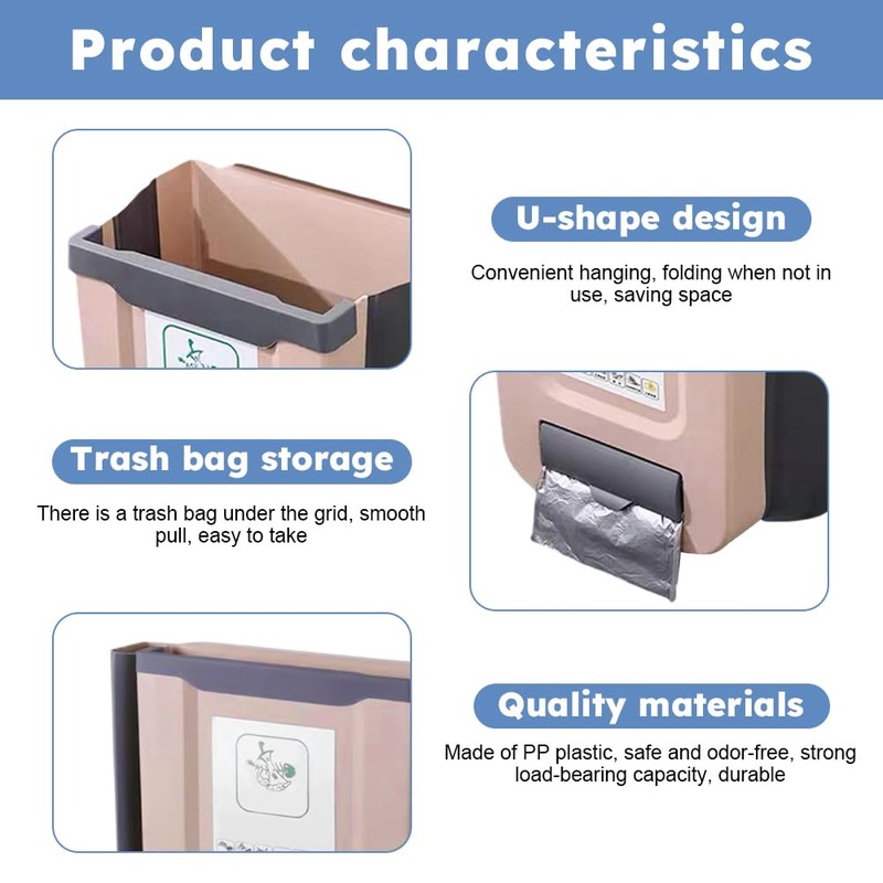 【DURABLE MATERIAL】The trash can is made of PP plastic, which is safe, harmless, odorless, durable, strong load-bearing, wear-resistant, waterproof, easy to clean, and can be used for a long time. Foldable when not in use, save space.