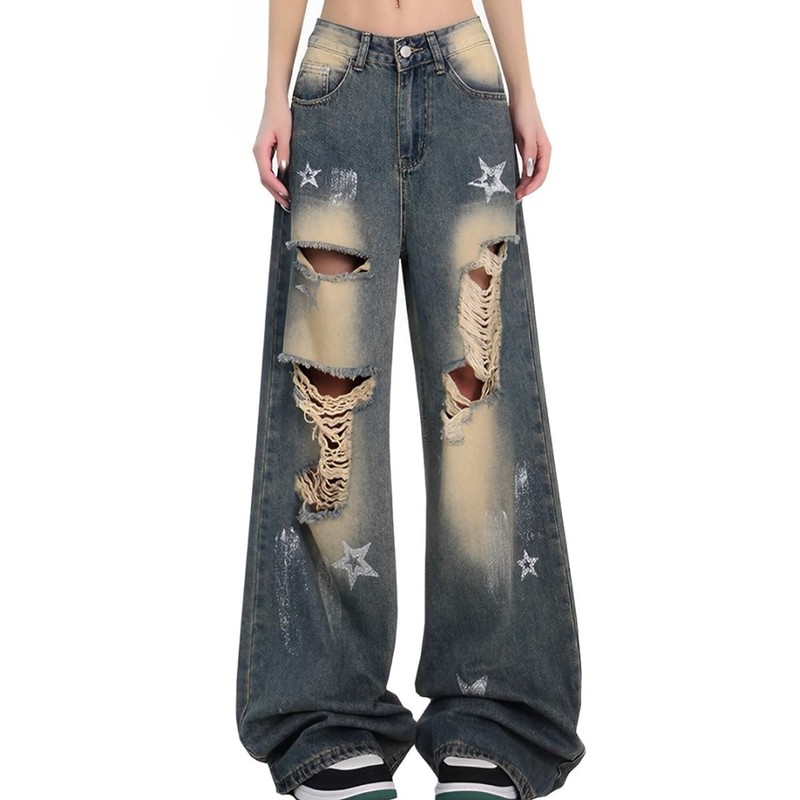 kakarin choyx Fashion Vintage High Waisted Baggy Wide Leg Ripped Jeans Y2K Star Washed Casual Straight Leg Denim Pants M