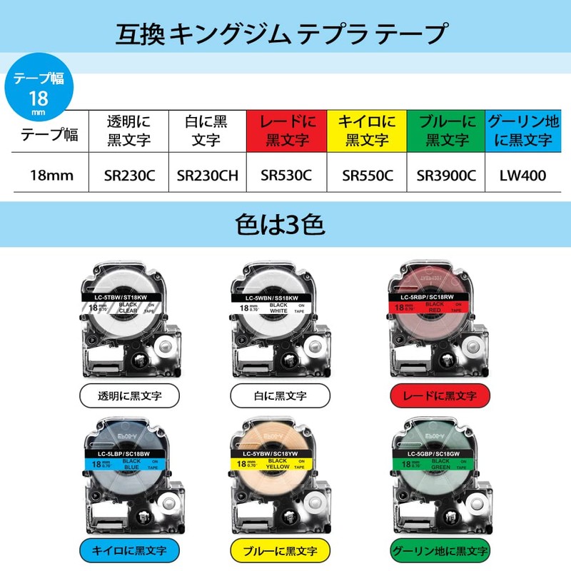 KAKASHI Tepra Tape 0.7 inch (18 mm), Compatible with King Jim Tepra PRO Tape Cartridge, Transparent, White, Red, Yellow, Blue, Green Background with Black Characters ST18KW, SS18KW, SC18BW, SC18YW,