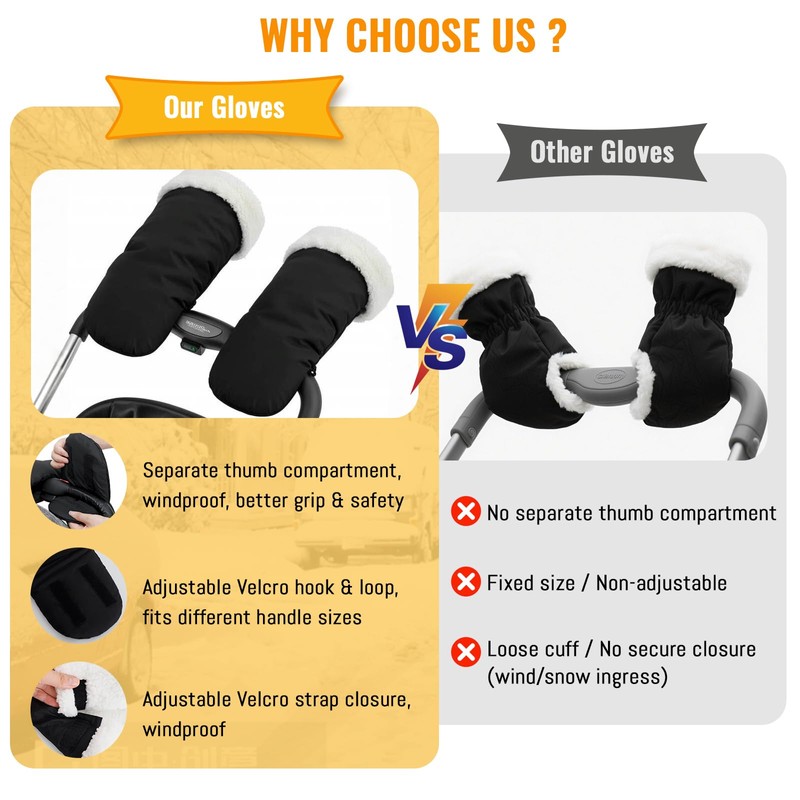 • Waterproof & Easy-Clean: These stroller mittens are made from the softest plush lined and Oxford fabric,Water repellent shell with sealed seams creates a weather-proof barrier against snow,sleet,winter winds,machine-washable ,perfect stroller gloves for winter