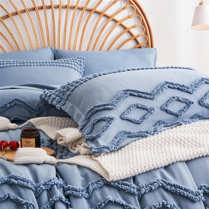 - [Unique Tufted Design]: Blue comforter set features geometric textured pattern and tufted pom pom dots. The simple yet sophisticated design gives your room a nice update and boho modern chic look.Brighten up your home with elegant and serene vibe.