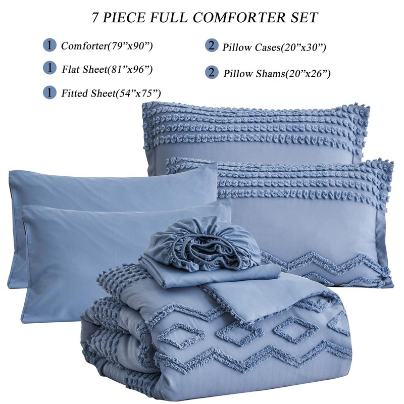 - [Full Comforter Set]: You can get a 7-piece tufted comforter set full size with 1 comforter(79”x90”),1 flat sheet(81”x96”),1 fitted sheet(54”x75”+16”),2 pillow cases(20”x30”),2 pillow shams(20”x26”). The tufted comforter full size may come wrinkled due to vacuum packed. Please kindly put it in the sun and pat gently for fluffy.