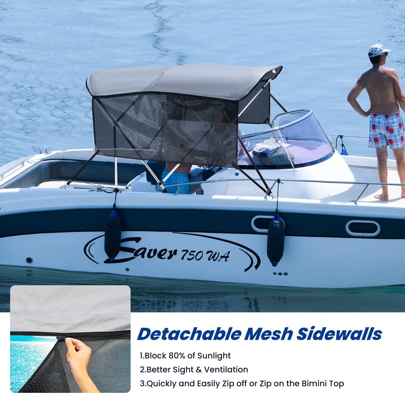 - Extra Mesh Sidewalls: Detachable mesh sidewalls block 80% of sunlight and keep good sight & ventilation, allowing quickly and easily zip off or zip on the boat canopy. SIDEWALL PATENT PENDING.