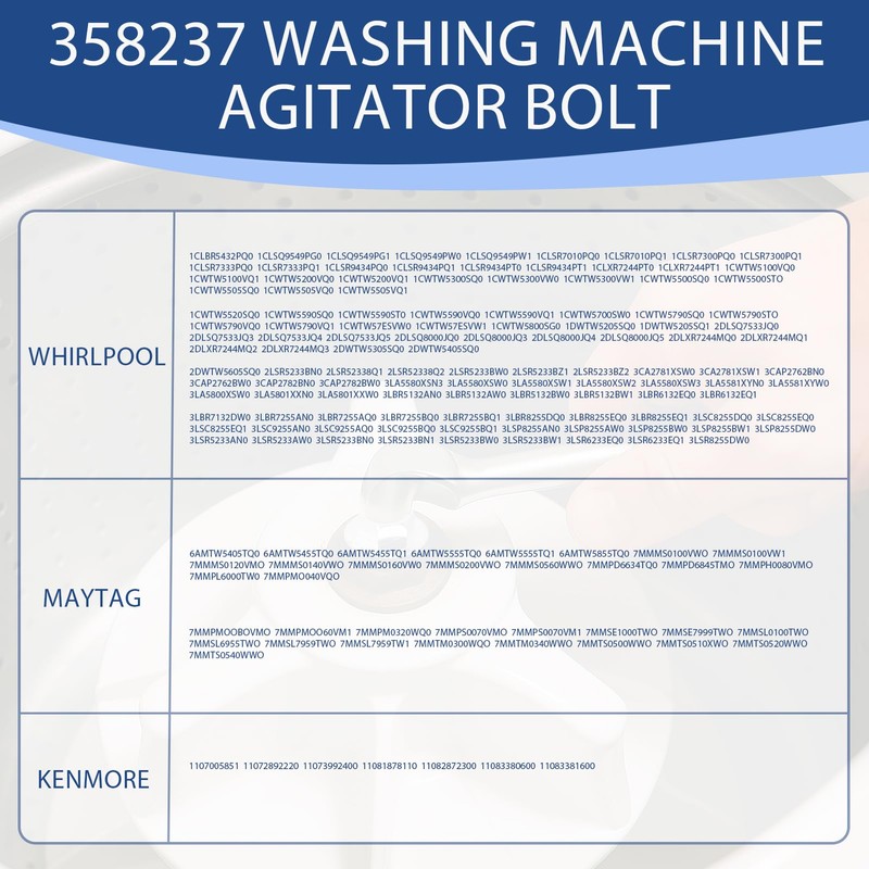 - Wide Compatibility: The WP358237 washing machine agitator bolt replacement is compatible with popular washing machines, including Whirlpool. It directly replaces washing machine part numbers WP358237, 358237, 285009, 357082, 357083, 357231, 358500, 359198, 97831, and PS11741866. Before installation, please confirm your washing machine model to ensure a perfect fit
