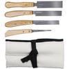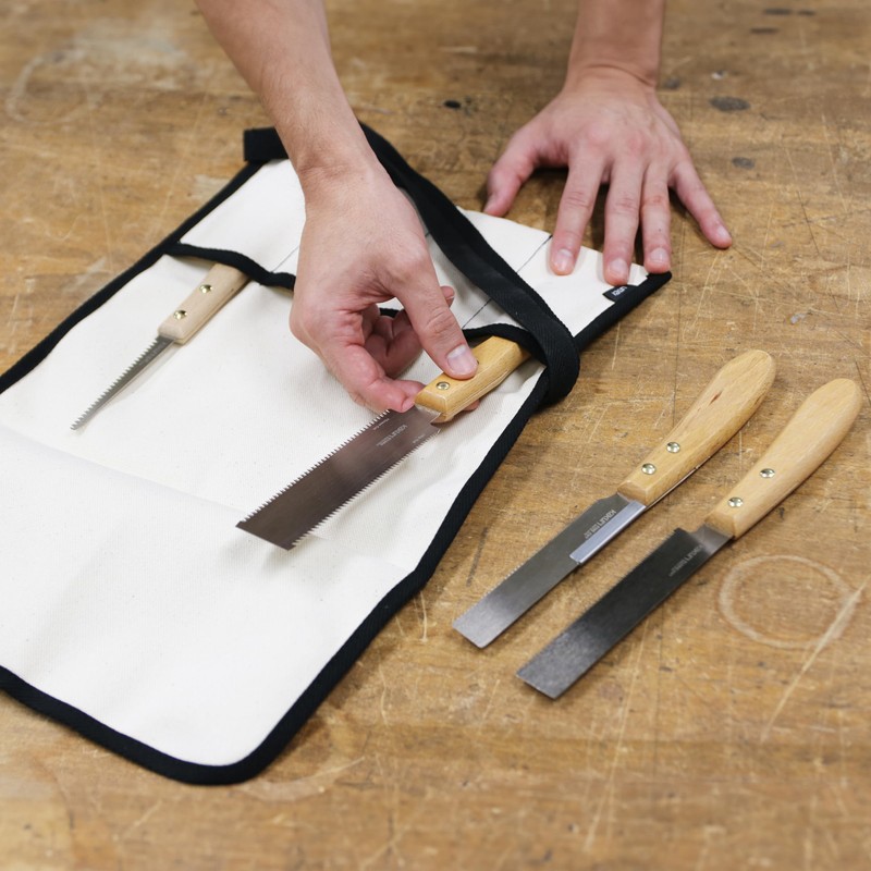 • [Product Specifications] Made in Japan / Blade Material: Japanese carbon steel (SK-5) / Handle Material: Beech / Rivet Material: Brass / Bag Material: Canvas / Blade Type: Ryoba 5", flush cut 5", dovetail 5", Keyhole 3" / Rolled Size: 11.2" x 5.3" x 0.9"