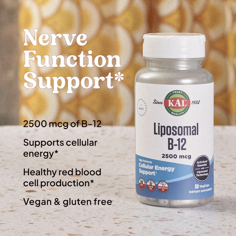 KAL KAL Liposomal Vitamin B12 2500 mcg, High Absorption, Liposomal Technology, Cellular Energy Support, Vegan Capsules, Gluten Free, Made Without Soy, 30 Servings